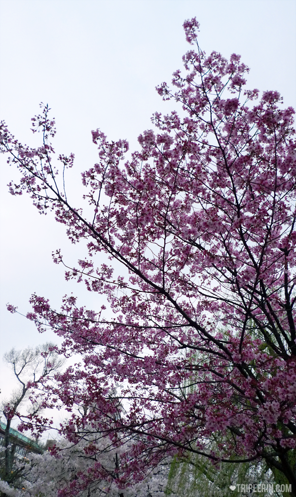 The cherry blossoms last for only about 2 weeks, before the winds and warm weather cause the petals to all fall off and the branches to sprout green (really ugly btw).